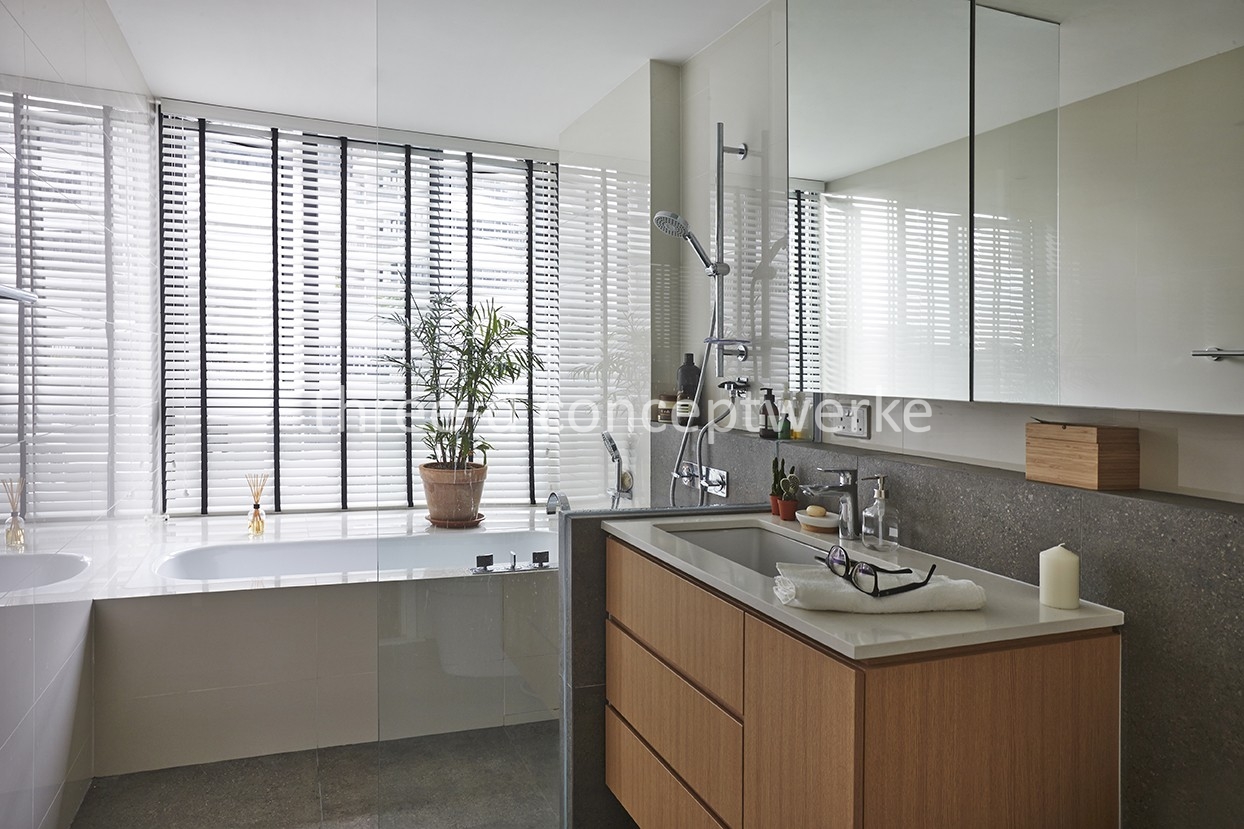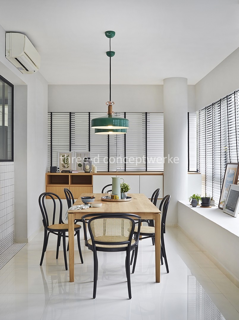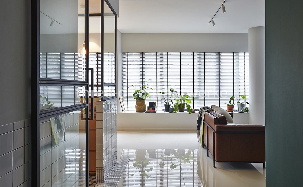 The walls were kept a light, cool grey throughout the apartment as a stage for the client’s collection of framed posters, tin robots and other ornaments, not forgetting their love for potted plants. The carefully chosen furniture in the living room attest to their taste in unique statement pieces, luxuriously wrapped in leather with beautiful wood frames or gorgeously curved metal.
