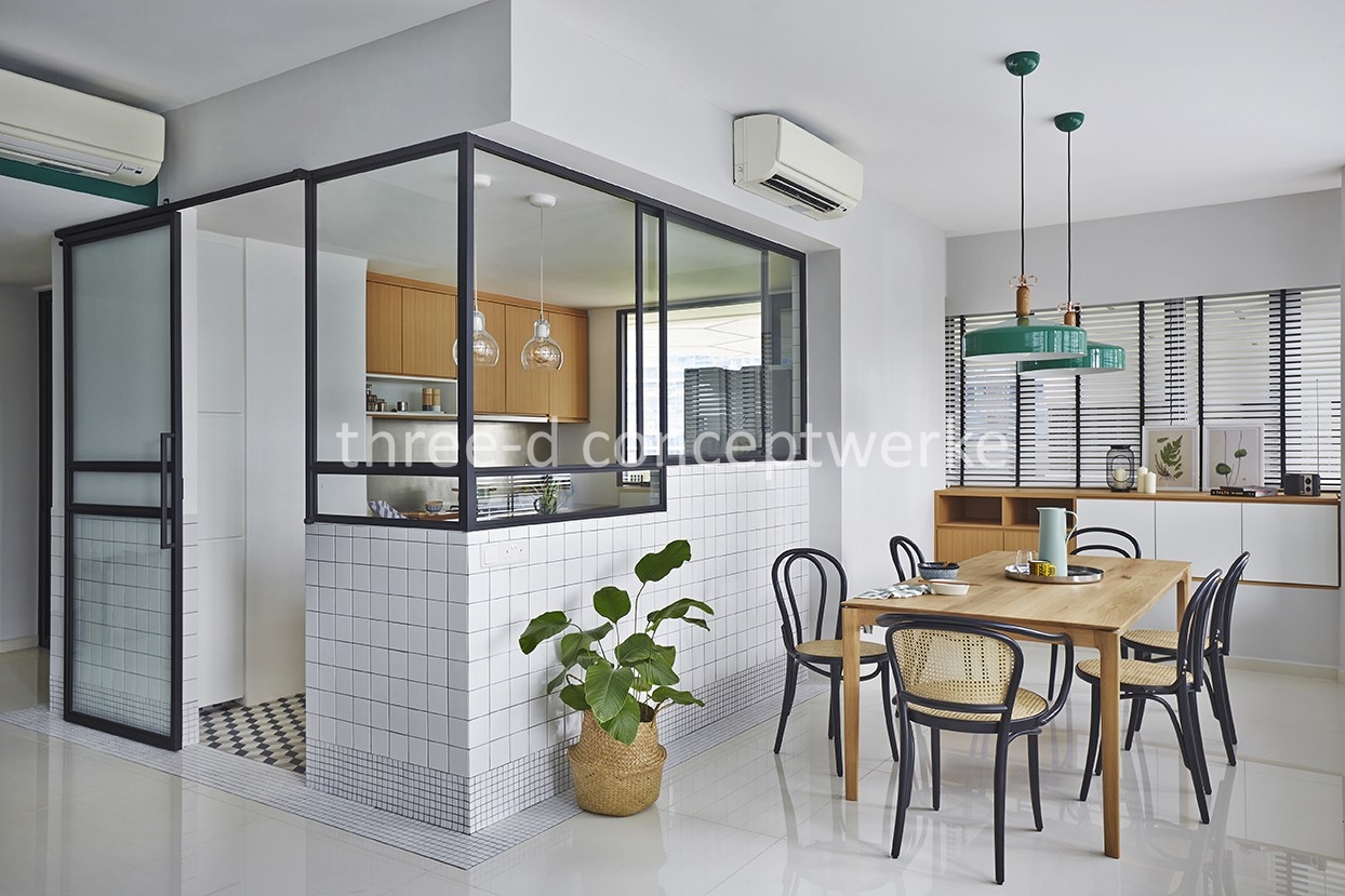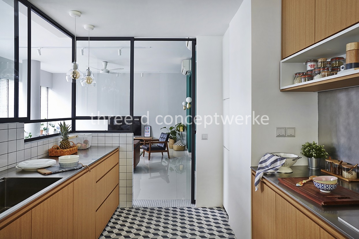 The kitchen could easily have been cracked open to flow into the adjoining space but we chose to contain the cooking area to allow for worry-free cooking. That decision gave birth to the black mild steel framed glass divider and the texture-laden mosaic tile wall it sits on. Within the kitchen, the cool stainless steel worktops were balanced out with warm wood cabinet fronts. A groovy geometric patterned floor adds movement to the otherwise calm space.